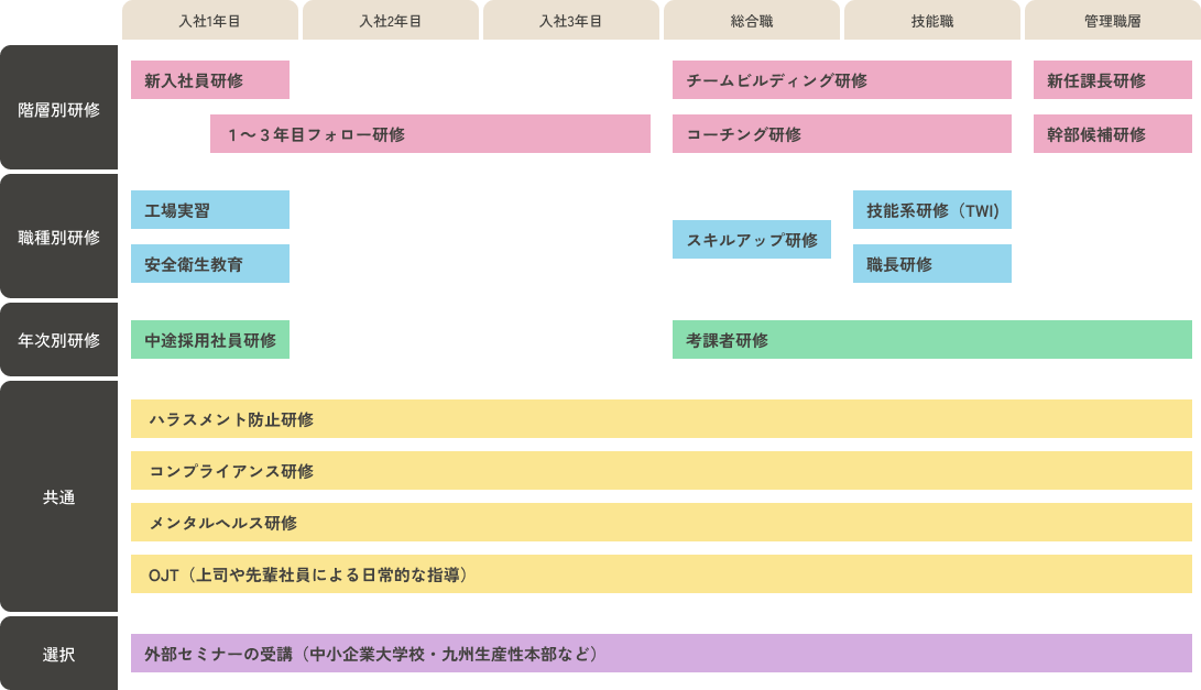 その考え方を土台として、教育制度や研修を通じた人材育成に取り組んでいます。