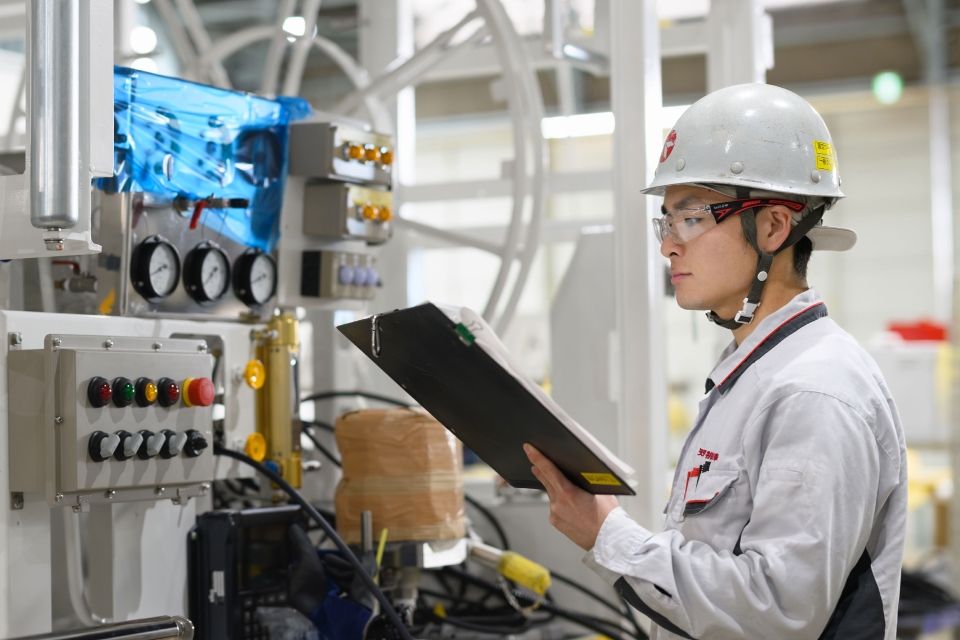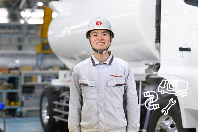 航空機給油車の製造工程はさまざまあり、現在は納車前の仕上げ工程を担当しています。もともと、いろいろな作業に挑戦したいと思っていましたが、実際に配属されると、想像していた以上に一つひとつの作業に高い精度が求められる仕事だと感じました。