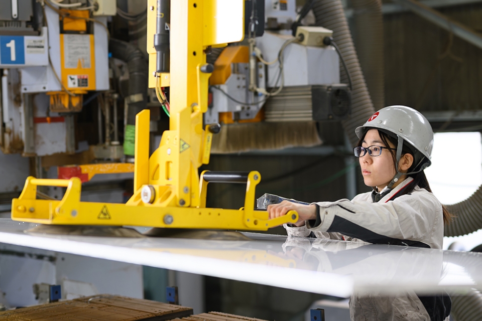 ドア班の仕事は、ドア用の板材をクレーンで吊って運び、お客さまの希望のサイズに合わせて機械で裁断するところから始まります。その後、手作業で穴を開け、蝶番にボルトを打ち込み、内側に断熱材を貼り、ドアハンドルの長さを調整して取り付けます。