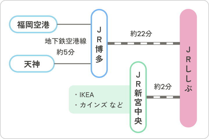 本社最寄りのししぶ駅から博多駅までは電車で22分。天神や福岡空港へも約30分と好立地です。