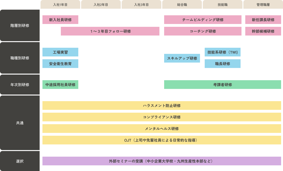 その考え方を土台として、教育制度や研修を通じた人材育成に取り組んでいます。
