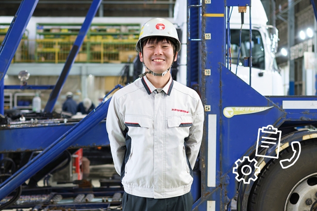 特殊車両の修理では、決まった正解があるわけではありません。車両の構造や使われ方、これまでの履歴などを一つひとつ確認しながら、その車両に合った修理方法を考えていきます。 修理フロントの仕事では、自分一人で判断するのではなく、工場や他部署と情報を共有し、相談しながら進める場面が多くあります。その中で、「この進め方が一番よさそうだ」と整理できたときには、仕事の手応えを感じます。また、修理の工程を考え、計画どおりに進み、無事に納車を迎えられたときには、大きな達成感があります。工場で修理をしていた頃とは違い、車両全体や修理の流れを俯瞰して見られるようになり、自分の視野が確実に広がっていると感じています。
